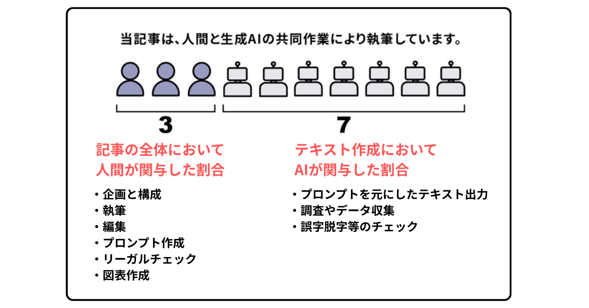 当メディアで人間の割合が2もしくは3の記事は、おおよそ三田がプロンプトを書き、AIで文章のたたき台を作成したのちに人間の手で再編集した記事になります。