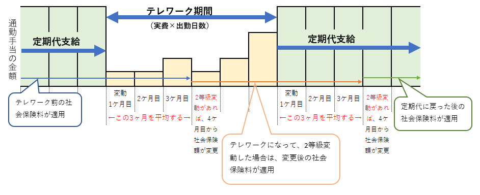 月額での支給から経費精算になった月の賃金が支払われた月から、3か月間の賃金の総額の平均を計算し、2等級以上変動していたら、4か月目に社会保険料の変更手続きをする必要があります。テレワークが終わり、月額の支給に戻った際にも、変動手続きが必要になります。