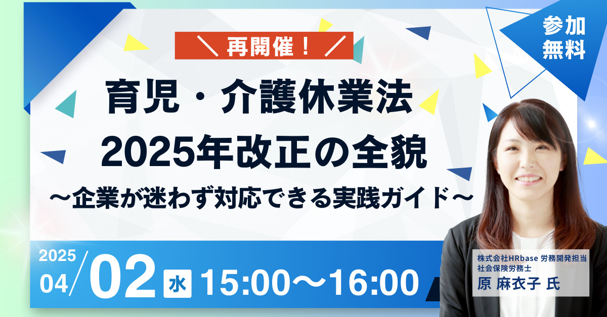 本セミナーでは、法改正の詳細、規程整備のポイント、企業が取るべき実務対応について徹底解説します。育児・介護制度の適切な運用で、リスクを軽減するためにもぜひご参加ください。